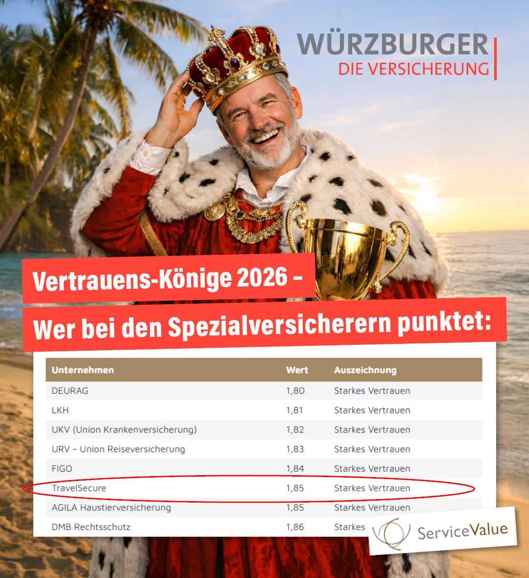 Die Reiseversicherung der Würzburger Versicherungs-AG bestätigt erneut ihre Spitzenposition: Im aktuellen Finanztest der Stiftung Warentest (Ausgabe 1/2026) erzielt TravelSecure im Bereich Reiserücktritt die Bestnote SEHR GUT (1,2) und wird damit wieder vierfacher Testsieger.